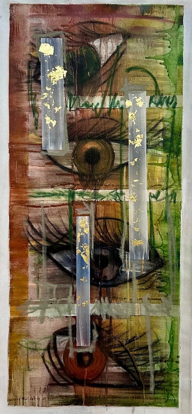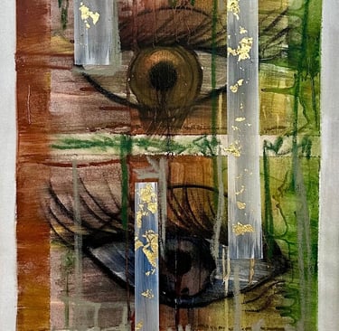 Watercolor, Acrylic, Oil Pastel and Charcoal on Gesso Canvas with Gold Leaf