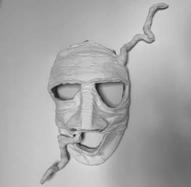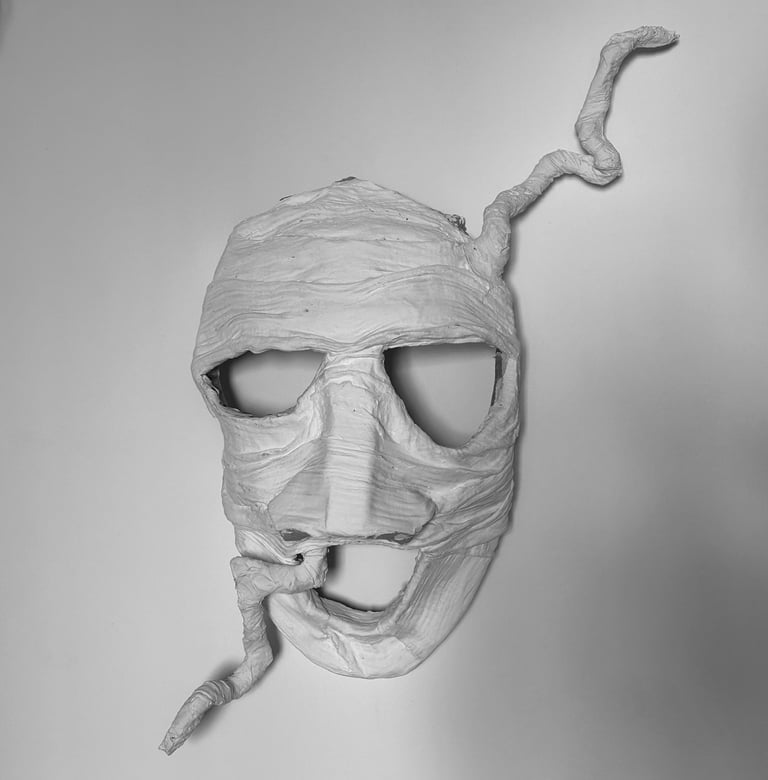 Paper mache, textile and plaster on cardboard and wire form, acrylic, natural and synthetic fiber