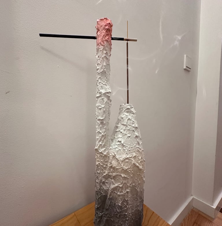 Paper mache and plaster on recycled glass bottle, wood and watercolor, acrylic