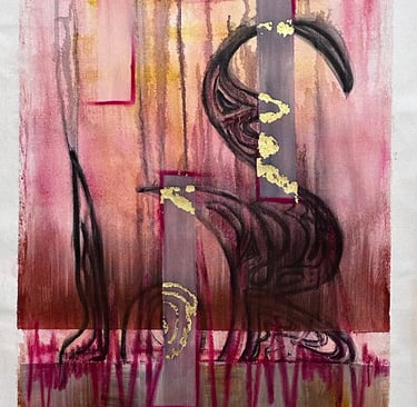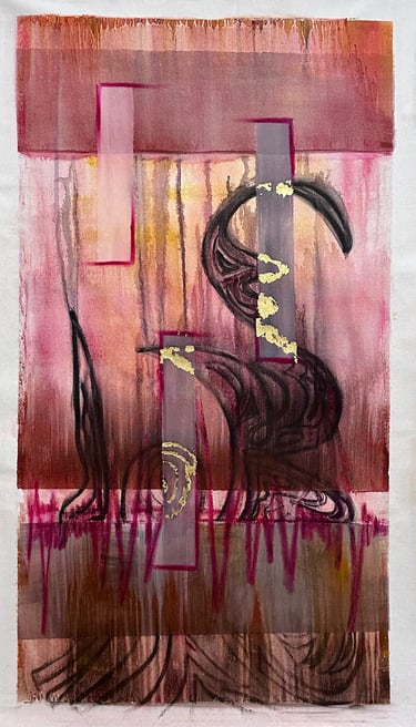 WATERCOLOR, ACRYLIC, OIL PASTEL, CHARCOAL AND GOLD LEAF ON GESSO CANVAS