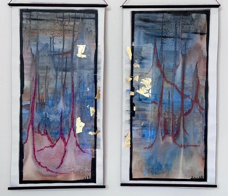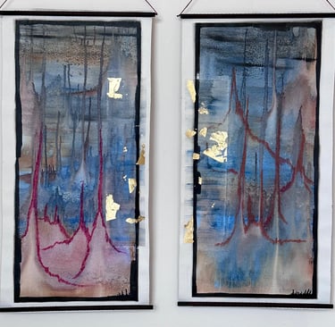 Watercolor, Acrylic, Oil Pastel and Gold Leaf on Un-stretched Canvas, Wooden Dowels and Embroidery Thread.